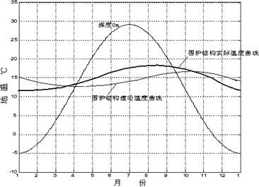 由此可知,對于地下建筑,自然情況下圍護結構溫度波動幅度較小,并有時間延遲,對于平均埋深約5米的地下建筑,其溫度波幅僅為地面的1/5左右,并且溫度波延遲約3個月,使得工程在春夏之交的季節,圍護結構溫度仍處于一個較低的水平。