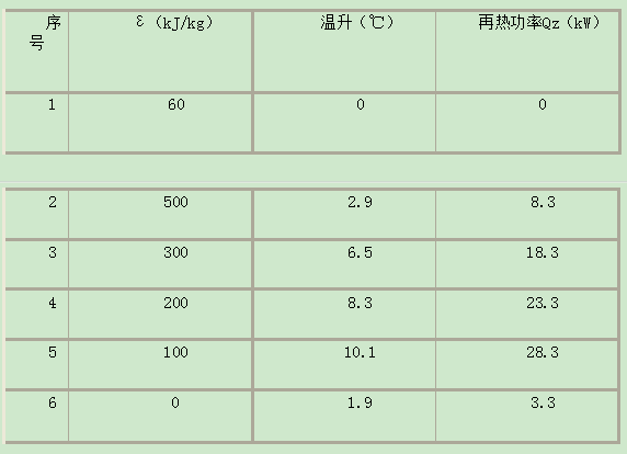 因此,從空氣處理原理可知,要確保工程內的濕度不致過高,再熱是無法省略的,但對于余熱較小的地下工程,其再熱量是非??捎^的,表2表示熱濕比ε和再熱量之間的關系(送風量為100kg/h,工程的相對濕度為70±5%,溫度為26℃,工程散濕量為18kg/h)。