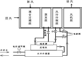 顯然,工程余熱量Q愈小,ε就愈小,要求的再熱量Qz就越大,如采用電熱,這既增加了運行能耗,又增加了設備容量,顯然難以推廣使用。有人提出利用回風熱回收來實現再熱[2]設想,即回風和新風混合后,不直接送至冷卻裝置進行處理,而是先進入一個全熱交換器與空氣冷卻裝置的出口空氣進行(全熱)交換,一方面實現再熱,另一方面對進入冷卻裝置混合空氣進行預冷,實現這種設想一方面將會使裝置非常龐大,系統變得非常復雜,另一方面,全熱交換還會使被處理的空氣在再熱的同時被“再濕”,顯然行不通。因此,目前比較可行的方法是利用制冷系統的冷凝熱實現再熱,以替代用電及蒸汽加熱,節約大量能源。
