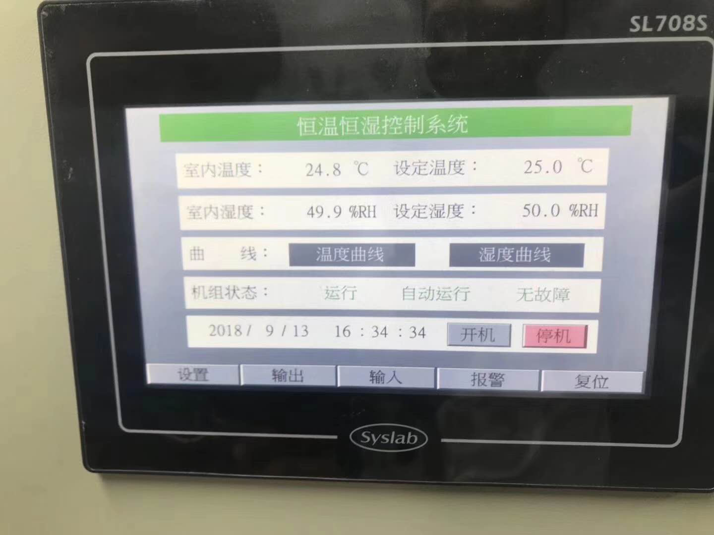 由于溫度、濕度傳感器的精度、安裝位置影響,以及傳輸線路長短的影響,設定的回風參數與實際測量的結果存在一定的誤差,必須通過回風溫度T、回風濕度進行補償,以進行校正。具體方法是,根據空調空間的大小,在室內約lm高的空間 均勻布點,用精度高的水銀溫度計、毛發濕度計進行測量,通過對處理結果進行統計分析,把結果與在顯示屏顯示的溫度、濕度進行比較,找出偏差值,在觸摸屏上進行補償設定。