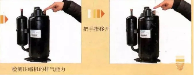 首先,將壓縮機卸下, 加電使其運轉(zhuǎn),用手指堵住壓縮機的排氣孔片刻, 再將手指移開。 由于壓縮機內(nèi)有壓力, 所以當用手堵住壓縮機的排氣孔時, 應(yīng)感到有排氣壓力;當把手指移開時, 可以聽到 “呲呲的排氣聲, 而且排氣壓力正常的壓縮機,應(yīng)很難堵住壓縮機排除的氣體,這表明壓縮機性能良好。如果用手堵住排氣管時感覺不到壓力, 將手指移開時,聽不到排氣聲, 則說明該壓縮機性能不良。如下圖所示: