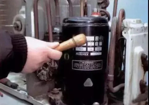 一般選擇木錘或者就地選擇可用物件。在壓機啟動時重錘敲擊其身上的三個焊點。但要注意力道,不能敲變形。輕輕地敲擊壓縮機外殼,把卡住部位稍微振松,有時可啟動運轉(zhuǎn)或把電源電壓往上調(diào)高10%,多次啟動沖擊,這個方法可解決潤滑不夠的卡缸現(xiàn)象,對旋轉(zhuǎn)式壓縮機特別有效。