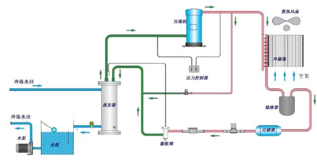 當(dāng)空氣冷卻式制冷機啟動時,制冷劑吸收蒸發(fā)器中被冷卻物體的熱量并蒸發(fā)。壓縮機不斷地從蒸發(fā)器中提取產(chǎn)生的氣體,并將其壓縮成高溫高壓蒸汽。然后,制冷劑蒸汽被送往冷凝器,在那里與空氣進行熱交換。釋放熱量后,它凝結(jié)成液體。液體制冷劑在被膨脹閥減壓后,進入蒸發(fā)器,在那里再次蒸發(fā),吸收冷卻物體的熱量。重復(fù)該熱交換過程,直到工業(yè)用水冷卻到所需溫度。